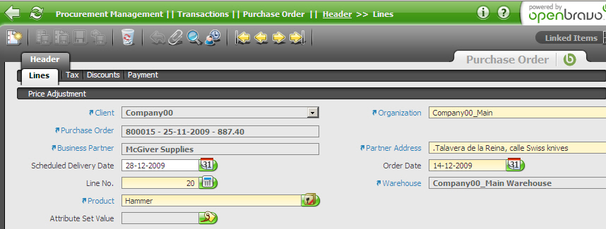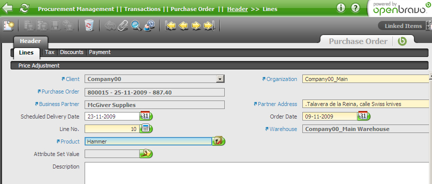 | defect | [Openbravo ERP] 03. Procurement management | minor | always | 2009-12-02 13:04 | 2017-05-29 13:45 | |||||||
