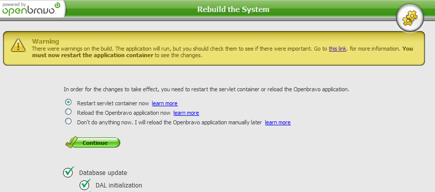| Description | After a Rebuild, I have three options with following message: In order for the changes to take effect, you need to restart the servlet container or reload the Openbravo application. (o) Restart servlet container now ( ) Reload the Openbravo application now ( ) Don't do anything now. I will reload the Openbravo application manually later The issue is that default action should be the only available option. Other options could take the system down if, for example, user forgets to manually restart. This is specially important after a Core update, since Database was actually updated although tomcat was not restarted yet, so you are in an intermediate stage until Tomcat restart. | |||||||||||