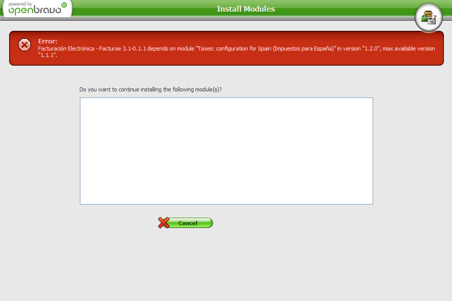 | Steps To Reproduce | 1. Use an Openbravo instance with Spanish Localization pack pro v1.1.0 installed 2. Check that "Taxes: configuration for Spain (Impuestos para España)" module is installed, version 1.1.1 3. Install the Spanish Localization pack pro v1.2.0 from an obx file (you will need Tax Report Launcher and eInvoice modules) 4. You have an error message saying that "Facturación Electrónica - Facturae 3.1-0.1.1" depends on module "Taxes: configuration for Spain (Impuestos para España)" in version "1.2.0", max available version "1.1.1". See attach. 5. Double check that required module is included in the pack you are installing. | |||||||