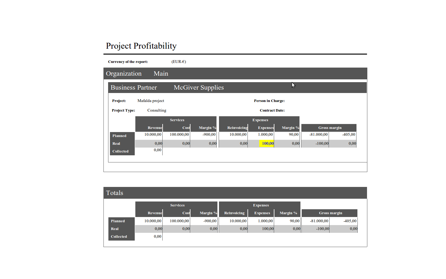 | Steps To Reproduce | -As Openbravo Admin go to Procurement Management || Transactions || Purchase Invoice -Create a new record: -Bussines Partner: Mcgiver. -Project: mafalda - Mafalda project -Save and go to Lines, create a new record: -Product: Consulting Service. -Unit Price: 100 -Tax: Exempt. -Order UOM: 'empty' -Save and go to the header. -Complete. -Go to Project & Service Management || Analysis Tools || Project Profitability -Business Partner: Mcgiver. -Project: mafalda - Mafalda project -Click 'HTML format' -Realize that the invoice's amount has been added to the column Expenses. | |||||||