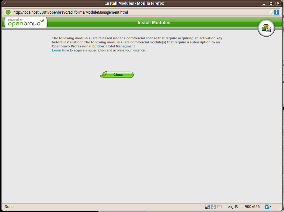| Proposed Solution | The correct message should be: The following module(s) are released under a commercial license that requires acquiring an activation key before installation: Hotel Managment Learn how to acquire modules. | |||||||