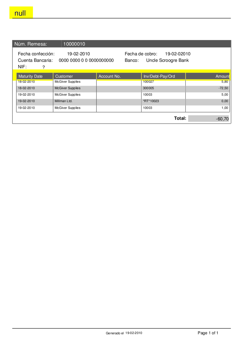 | Steps To Reproduce | -As Openbravo Admin go to Financial Management || Receivables & Payables || Transactions || Remittance -Click Print Record (In a Remittance with complete lines) -Realize that NULL appears. (File attached) | |||||||