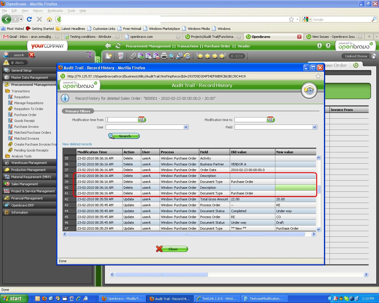 | Summary | 0012405: While checking the audit trail for delete records, some records are displayed twice. | |||||||