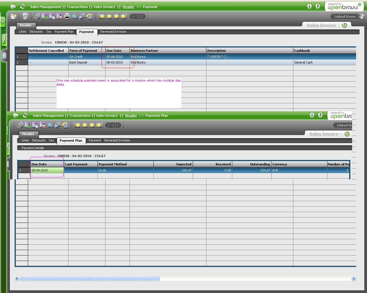 | Steps To Reproduce | Login with user having access to Openbravo admin role Navigate to Sales invoice window (Sales Management || Transactions || Sales Invoice || Header) Click “New” to create a new record Then Select • BP: Millman Ltd. And verify the below details are getting filled automatically, once the user selects the BP • Price List: General Sales • Currency: EUR • Form of Payment: Money Order • Payment Terms: Immediate Change the payment Terms field from Immediate to “One Month” Navigate to “Lines” tab Click “New” to create new line item details • Product: Hammer • Qty: 10 • Net unit Price: 5.80 • Tax: VAT 16% Move back to “Header” tab Verify the amount details • Total Net Amount: 58.00 • Total Gross Amount: 67.28 Move to Payment tab to create a payment document manually Click New Enter the below details • Form of Payment: Money Order • Due date: 10/06/2010 • Amount: 25.00 Click Save Navigate back to header tab Click “Complete” button “Process Completed Successfully” message appears Move to Payment tab, and verify two lines with two different due dates Line 1: Due date: 10/06/2010 and Amount : 25.00 Line 2: Due date: 05/04/2010 and Amount : 42.28 Then to verify two schedule events are generated for the invoice Move to Payment Plan tab You will find, only one line item appears instead of two lines Line 1: Due date: 05/04/2010 and Expected Amount: 67.28 | |||||||