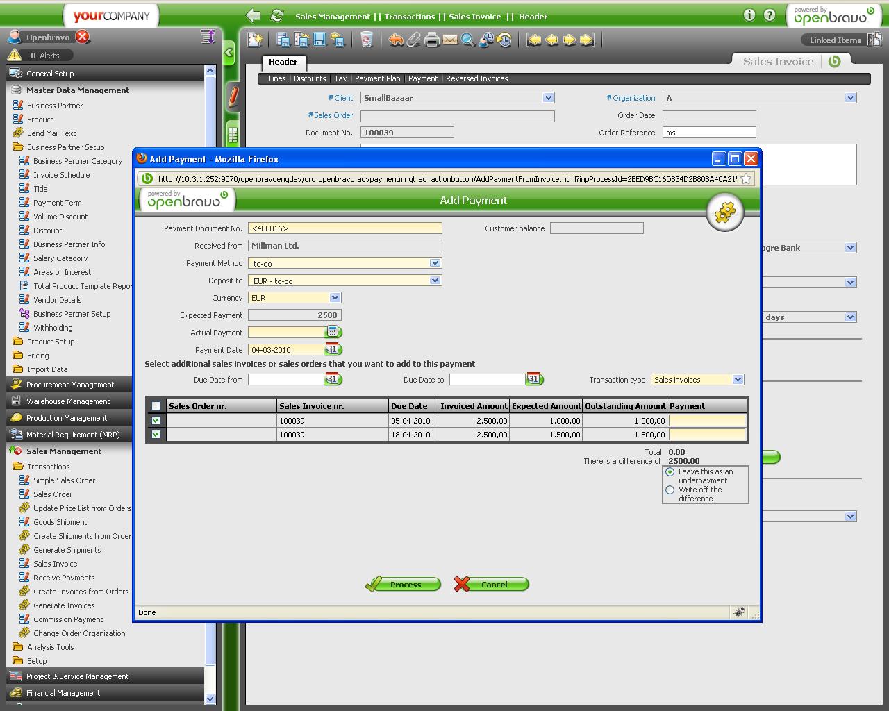 2010-03-16 10:15 hgbot Fixed in SCM revision => http://code.openbravo.com/erp/pmods/org.openbravo.advpaymentmngt/rev/f0f8e15e8228dfe7d28c2f36a8d6f1d39f38063a [^]
