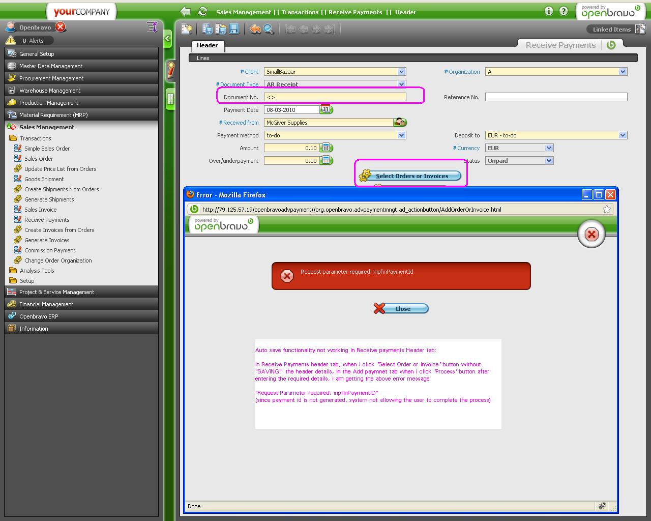 | Steps To Reproduce | Create and complete a invoice for any business partner.(BP: Red Bunny, Invoice Grand total Amount: 20.70) Navigate to Receive payments and click "new" Enter BP: Red Bunny Amount: 20.70 Without Saving the Header details, click "Select order or invoice" button In the "Add Payment" dialog window, Click "process" button and confirm it by clicking "OK" button Right now system throws the bellow error message. "Request parameter required: inpfinPaymentId", which says Payment id for this record not yet generated. | |||||||