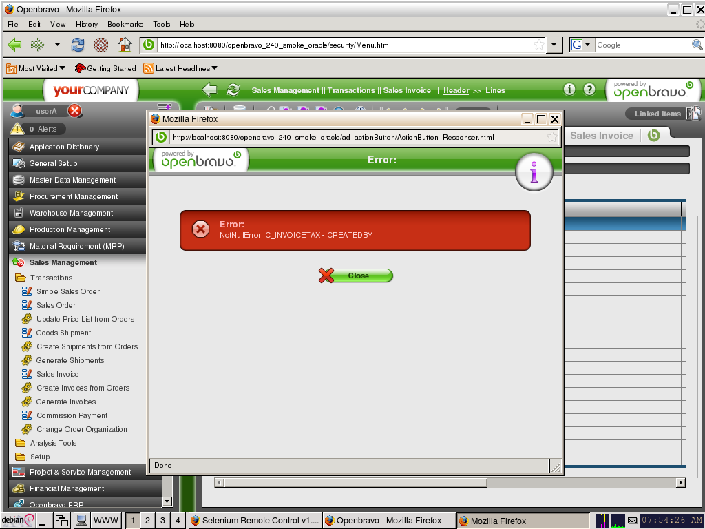 | Steps To Reproduce | * Login as userA * Go to Sales management->Transactions->Sales order * Create few sales order with transaction document "Standard Order" * Create Goods shipment for the sales orders. * Go to Sales management->Transactions->Generate invoices * Select an invoice date and click OK You will see the error message (Please refer the attached screenshot) | |||||||