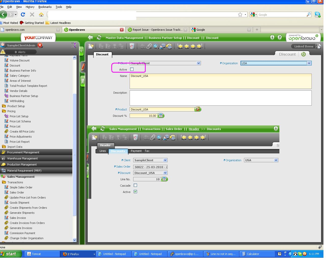 | Steps To Reproduce | 1) To Crete a product name "Discount 10%" Navigate to Master Data Management || Product || Product window and click and enter Name & Search key as "Discount 10%" and click save. 2) To create Discount name "Discount 10% applies to BP:Red bunny" Navigate to Master Data Management || Business Partner Setup || Discount || Discount and click New t Then enter the below details Name: Discount 10% applies to BP:Red Bunny Product: Discount 10% Discount: 10% and click save 3) Assigning the "Discount 10%" to BP:Red bunny Navigate to Master Data Management || Business Partner || Business Partner and select the BP: Red Bunny Then select the "Discount" sub tab Click new and enter the below details Discount: Discount 10% applies to BP:Red Bunny And check all the below check boxes Apply in order: Check Customer & vendor: Check 5) Deactivate the Discount Navigate to Master Data Management || Business Partner Setup || Discount || Discount And select the above created Discount: Discount 10% applies to BP:Red Bunny And un check the "Active" checkbox and click save 4) Create a sales order for Red bunny Create and complete a sales order for the above business partner with below details BP: Red bunny, Product: Hammer, qty: 1 then click complete button Expected result: Verify 10% discount Should not apply to the order after the order is completed Actual result: Discount is wrongly applies to the order. | |||||||