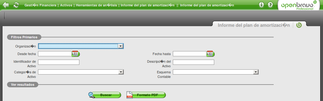 | Steps To Reproduce | 1) Navigate to Gesti�n Financiera || Activos || Herramientas de an�lisis || Informe del plan de amortizaci�n 2) See several ? marks in letters with accent (see screenshot) | |||||||||||