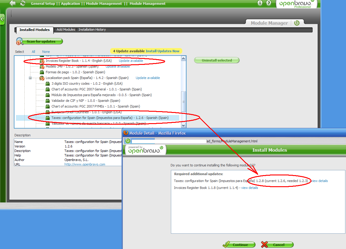 5. Since it has a dependency, you are prompted to also install an update for Spanish taxes. But the required version already installed 1.2.6, meets the requirements (min version 1.2.3), so I should not be prompted for installing 1.2.8. See attach.