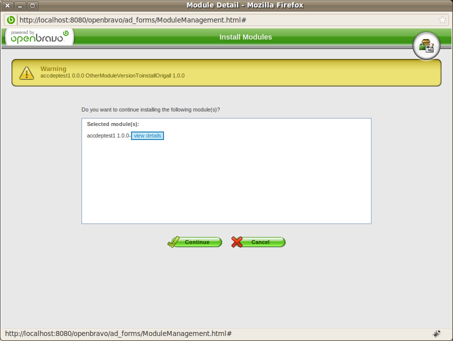 Note: after using the continue button the process continues s expected and install the 1.0.0 version of module B as expected.