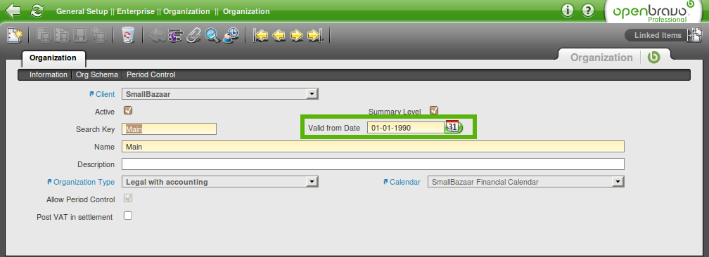| Proposed Solution | This has to be built in an extension module. 1) Add a "Valid from Date" mandatory field in Organization window (see screenshot). "On create default" value will be '01-01-1900' [1] 2) Add a validation logic to the Organization drop-down in ALL the transactional windows in order that only valid ones (the ones which Valid From Date >= Today) can be selected. [1] http://wiki.openbravo.com/wiki/ERP/2.50/Developers_Guide/How_to_define_an_oncreatedefault [^] | |||||||