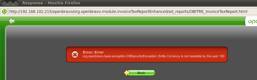 | Steps To Reproduce | . create new role with access level "entity/organization" . windows access: is empty . process access: create a new record "multidimensional tax report" . run report Patricia: Right steps are: . create a new role with access level "entity/organization" . assign the new user role to User "Openbravo" in the application path: General Setup || Security || User || User >> User Roles . go back to the window Role and then go to windows access tab and remove all windows . go to process access and make sure that the "Multidimensional tax Report" is there . run the report, system shows below error. | |||||||