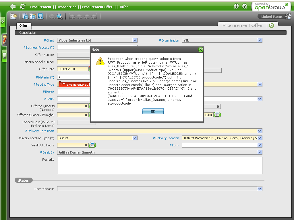 Hi, We would like to thank you for providing solutions to few of our reported issues, but there are still some issues (topics) that remain unresolved. After applying MP21 and Updates pertaining to Selector and related modules following is the status: 1. If we are having any list reference as an identifier then the selector does not show it in the identifiers (in the edit mode for suggestion box); while it does show only the SEARCH KEYS of the list items NOT the name of list items, in the grid view. Status: Popup window fails to open, when we try to launch the Popup then a JavaScript error is thrown- "OB.RemoteCellManager is undefined" 2. When we set the reference for a column of type UI selector, then after compilation of that window; the selector’s suggestion box shown is NOT proper, the sequence of the fields for selector changes and as soon as some one types some value (in suggestion box) for the selector, then it throws a Null Pointer Exception, showing the HQL generated. Status: The problem remains unresolved with MP A few screen shots having details of the issue named as obuiselector error_1.PNG, obuiselector error_2.PNG and obuiselector error_3.PNG are being attached 3. Once a column in a table had been set as having reference type UI Selector then whereever that table was referred the screen started throwing "NumberFormatException" Status: The problem has been solved 4. There was an observation while testing the selector, the selector failed to invoke / apply the validation for the related field Status: The problem has been solved 5. Primary key field's value shown in place of the qualified identifiers' values Status: The problem has been solved Thanks and Regards Team, Rareworld Technologies |