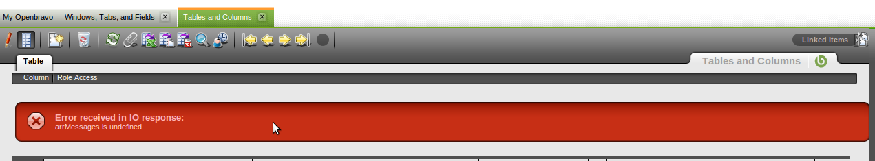 | Steps To Reproduce | Login to openbravo 3.0 RC1 Open a window from the menu. For example, Application Dictionary > Tables and Columns Just after clicking the menu item move the mouse to the top of the screen. Here the message does not appear. Now close the Tables and Columns window. Click again Application Dictionary > Tables and Columns from the menu. Just after clicking the menu item move the mouse over the tab "Table" The error message appears (see attachment) It disappears clicking the reload button. Once the error message appears once, every opened window will show it. Only clearing the cache makes it possible to open windows without the error. | |||||||