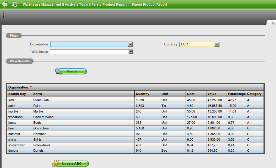 | Steps To Reproduce | Take the latest version of the live build (I took postgres one) As Openbravo Admin go to Warehouse Management || Analysis Tools || Pareto Product Report || Pareto Product Report Click 'search' Check that in the report it appears the product "Boot" as "A" Click 'update ABC' Go to Master Data Management || Product || Product >> Org Specific for the product "Boot" and check that the abc field has incorrectly the value "C". It should be A as it appears in the Pareto report. We had issue 8189 pending for quite a while, but the opposite was happening then: the report showed incorrect information, while the product was updated correctly. In this case the report is showing correct information, but the product is updated incorrectly. | |||||||