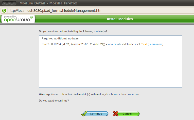 | Steps To Reproduce | Go to General Setup || Application || Module Management || Module Management - tab Settings and set below values to Test. - when doing a scan for updates, accept versions of the following status or highter = Test - when searching for new modules,accept versions of the following status or higher= Test - Save Go to Installed Modules tab, scan for updates and then you get below attached screen (scan_test.png). do not install anything, press cancel. Go back to General Setup || Application || Module Management || Module Management - tab Settings and set below value to General Availability. - when doing a scan for updates, accept versions of the following status or highter = General Availability - Save Go to Installed Modules tab, scan for updates and then you get below attached screen (scan_ga.png). do not install anything, press cancel. | |||||||