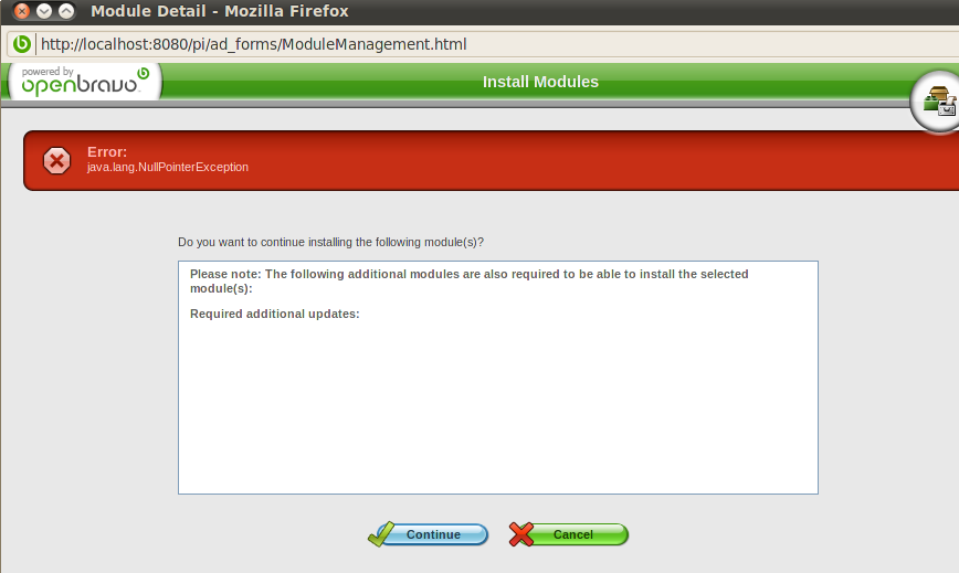 Note: problem is that in the last screenshot we do call printPageInstall1 without anything to install or update (as the current maturity_update level does not allow anything to be updated (anymore)). -> then inside npe happens. Suggestion for fix: - When changing the maturity_update (global) level to something more restrictive -> clear update_available,update_ver_id for all modules - When changing maturity_update for one module to something more restrictive -> clear update_available,update_ver_id for this one module For the user means we does not see the 'unavailable' updates anymore and needs to use scan for updates again. Note2: for the npe itself: its already marked as possible NPE by eclipse |