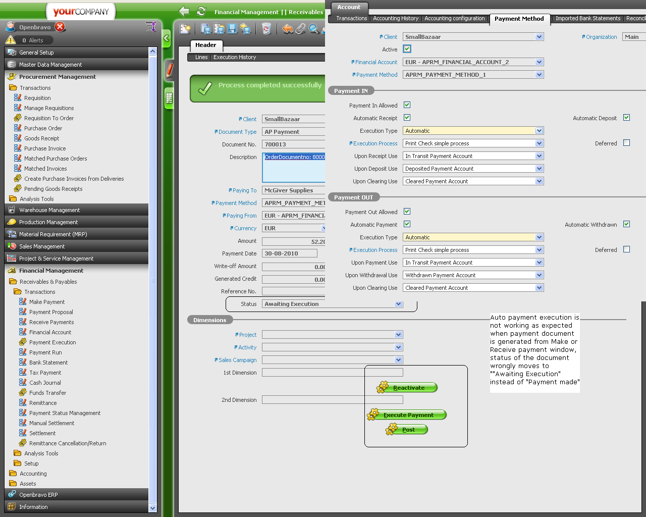 Defect: "Process completed successfully" message appears and status of the payment document wrongly moves to "Awaiting execution"