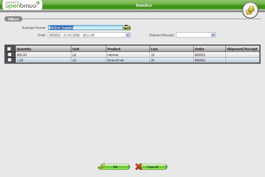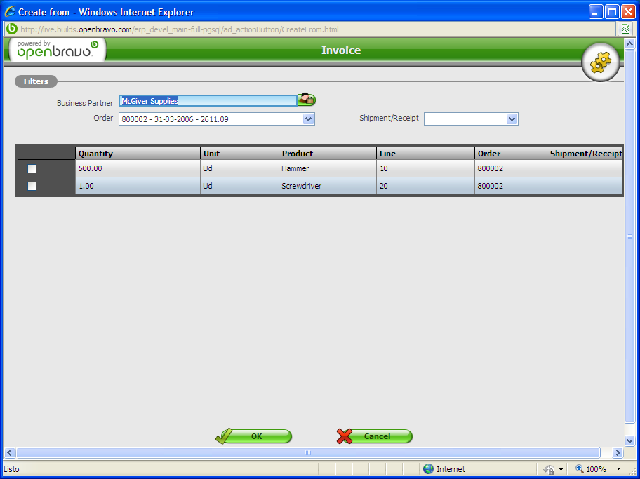 | Steps To Reproduce | Done in the live builds today: Reload Current Page Procurement Management || Transactions || Purchase Invoice || Header Enter a new Purchase Invoice, select BP and save click 'create lines from' and select an order from the pulldown with multiple lines. In IE 8 the collective box to select all lines is not visible (see snapshot) while in Firefox it's visible. | |||||||