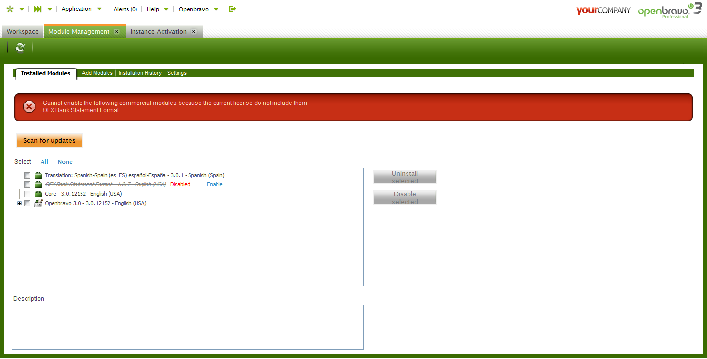 | Steps To Reproduce | 1. Login as Openbravo/openbravo 2. Activate a standard license 3. Go to General Setup || Application || Module Management || Add modules 4. Install, for example, IDL 5. Rebuild 6. Disable the module and deactivate the instance 7. Move back to Go to General Setup || Application || Module Management || Installed modules and try to Enable See attach. It says "...the current license do not" and should be "the current license does not" | |||||||