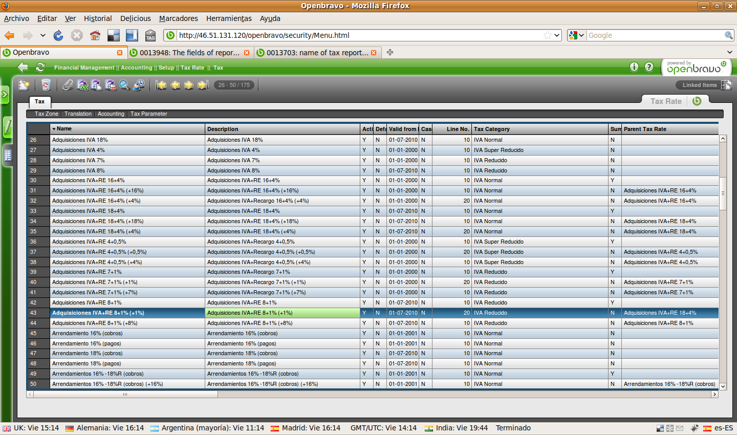 | Steps To Reproduce | Go to Financial Management / Accounting / Setup / Tax Rate / Tax and search for the tax rate : "Adquisiciones IVA+RE 8+1% (+1%)" Go to "Parent Tax Rate" field and realize that the tax rate below is shown: "Adquisiciones IVA+RE 18+4%" that is wrong. | |||||||