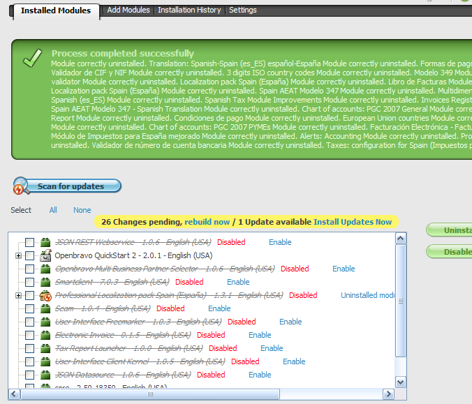 | Steps To Reproduce | 1. Scan for updates. At least one module has an update available. 2. Choose that module an uninstall it 3. Rebuild is required, but I still see the "1 Update available Install Updates Now" label that has no sense now since the module has been uninstalled. | |||||||