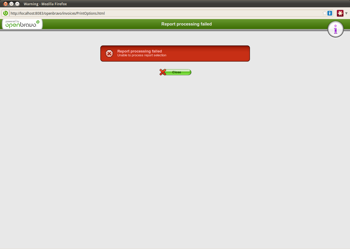 | Steps To Reproduce | 1) Download a VirtualBox Community Appliance 2.50 MP20 or above (you need logos in the reports, available from 2.50 MP20) 2) Configure VirtualBox using NAT networking and setup port forwarding on the host machine 3) Open a browser on the host and login to http://localhost:XXXX [^] where XXXX is the port that forwards to the VirtualBox guest. 4) Using BigBazaar Admin role, open a sales invoice and press the Print Icon. 5) Acknowledge the Print Details dialog by pressing one of the two buttons. 6) You will get an error: Unable to process your report request See attachment. Please notice that the error does not reproduce if: A) You access Openbravo using the IP address of the host (http://123.456.789.123:XXXX [^]) instead of localhost or B) You configure your document types not to include the logo | |||||||