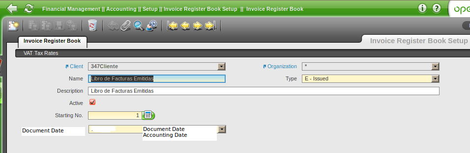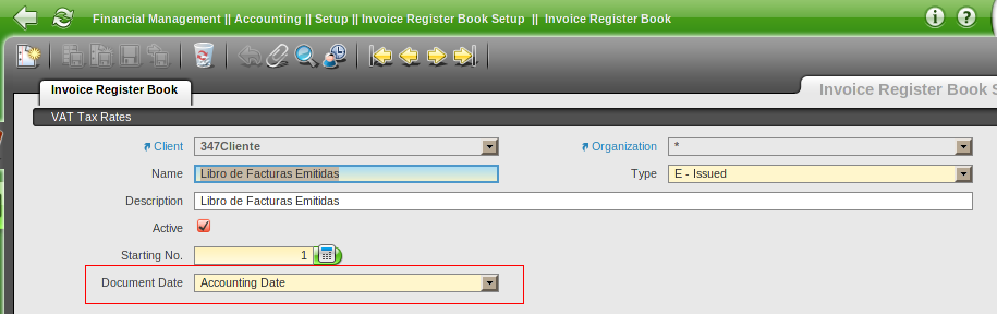 What the law says is that both the purchase invoices and the sales invoices must be taken in the VAT books by the Invoice Date. Anyway, we will adjust the books by adding two parameters in each book: - use invoice date - use accounting date The VAT can be allocated to the period in which those are posted (rather than by the time of devengo, which is what the law says, because there is a period of 4 years for VAT settlement). That is the reason why invoices are taken in the VAT reports by accounting date, which means that the invoices have been either issued or received. |