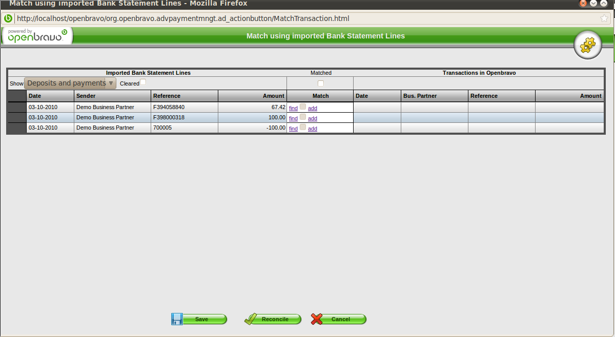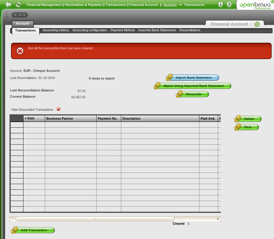 | Steps To Reproduce | Import a bank statement with some transaction lines. I have attached an example statement that can be imported using the Cuaderno 43 module. Click on Match using Imported Bank Statement. Do not match any of the items.....we will assume that the transactions are on the bank statement, but not in Openbravo. Click on Reconcile. You get an error message saying "Not all the transaction lines has been cleared." | |||||||