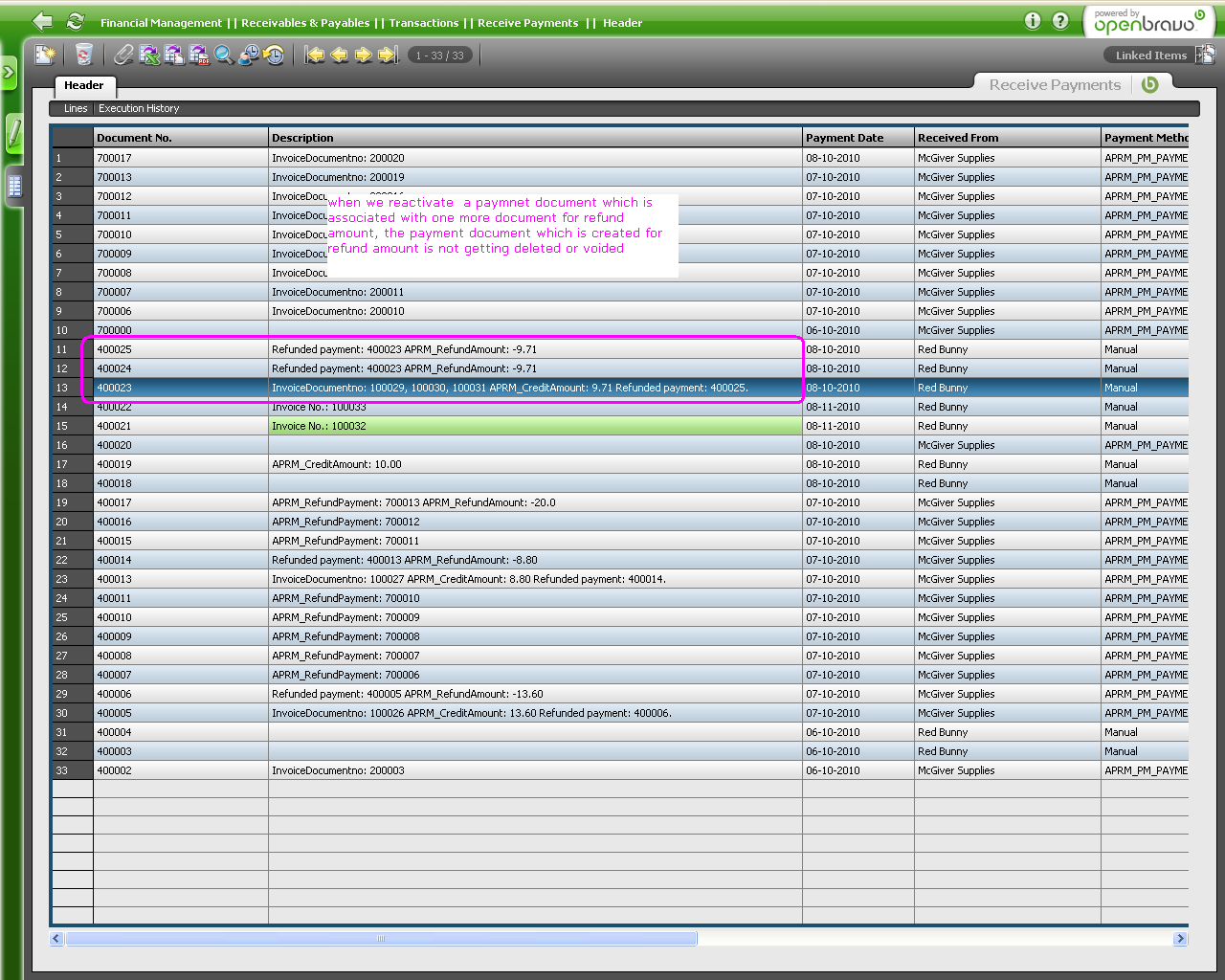 | Steps To Reproduce | 1) Create and complete a sales invoice for BP: Red Bunny & for amount:10 euros 2) Create a payment document (pay 1) for amount 15 euros, so 10 euros will be used to settle the invoice and remaining 5 euros will be returned to the customer. So system will generate a payment document Pay 2 for -5 euros ) 3) Try to Reactivate the payment document (pay 1) which is created for 15 euros, after reactivating the document one can see the description and amount, line item details will get deleted. 4) Then try to complete the payment document using the same payment details mentioned in step 2, once payment document is completed system generates one more Payment document (Pay 3). Error: Issue here is, one can see we have two payment documents (Pay 2, pay 3) referring the same payment document (Pay 1). Isssue 2: System allow the user to reactivate the payment document which is created for refund amount | |||||||