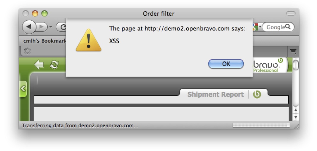 | Steps To Reproduce | 1. Copy and paste the following URL into Firefox after authenticating to http://demo2.openbravo.com: [^] http://demo2.openbravo.com/openbravo/ad_reports/ReportShipmentEditionJR.html?inpDateTo=555-555-0199@example.com&Command=&inpBpartnerId_DES=555-555-0199@example.com&inpcProjectId=&inpmWarehouseId=&inpcProjectId_D=555-555-0199@example.com&inpDateFrom=555-555-0199@example.com%22%3E%3Cimg%20src%3da%20onerror%3dalert%28%27XSS%27%29%3E&inpcBPartnerId= [^] 2. A Javascript Alert Box will display "XSS" as per the attached screenshot. | ||||||||||
