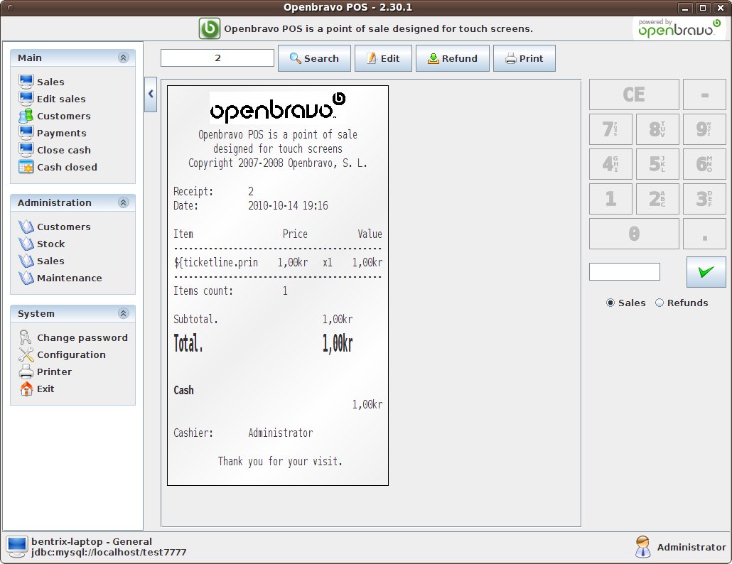 | Steps To Reproduce | 1. Compile source for 2.30.1 in NetBeans. 2. Run it. 3. Make a sale with price 1 (press 1, +, =). 4. Go to Edit sales 5. Search for ticket. 6. Display ticket. I did a quick test of this using the windows installer and derby. I got the same result. Expected result: The name of the product should be displayed, in this case "". Not "${ticketline.prin". See attached screenshot. | |||||||