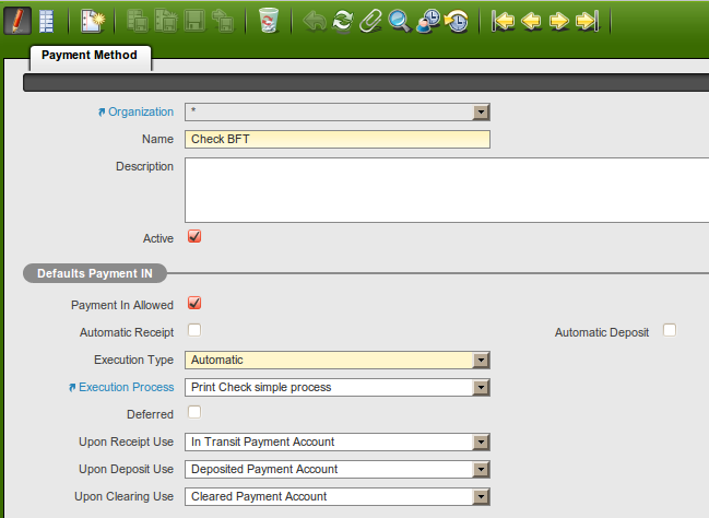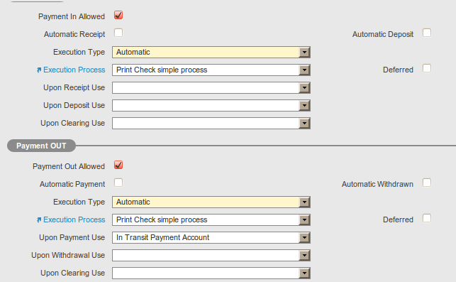 As appears from the screenshots the following fields do not get populated: Payment IN: Upon Receipt Use: In Transit Payment account Upon Deposit Use: Deposited Payment account Upon Clearing Use: Cleared Payment account Payment OUT: Upon Withdrawal Use: Withdrawn Payment account Upon Clearing Use: Cleared Payment account |