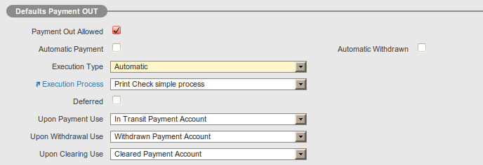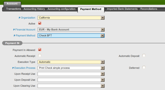 | Steps To Reproduce | See my snapshots Go to Payment method in the setup section and setup for example 'check' as a payment method, with values: Defaults Payment IN: Payment in Allowed: selected Automatic Receipt: not selected Automatic Deposit: not selected Execution Type: automatic Execution Process: Print Check simple process Upon Receipt Use: In Transit Payment account Upon Deposit Use: Deposited Payment account Upon Clearing Use: Cleared Payment account Defaults Payment OUT: Payment Out Allowed: selected Automatic Payment: not selected Automatic Withdrawn: not selected Execution Type: automatic Execution Process: Print Check simple process Upon Payment Use: In Transit Payment account Upon Withdrawal Use: Withdrawn Payment account Upon Clearing Use: Cleared Payment account Then go to the Financial Account for bank for example, go to the Payment Method tab and create a new record. Select in the Payment Method the above created Payment method. Some fields are now populated, some are not. See snapshots | |||||||