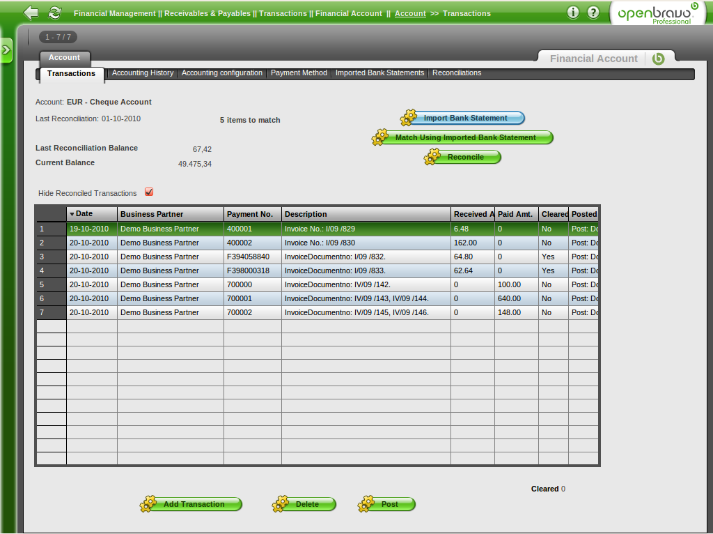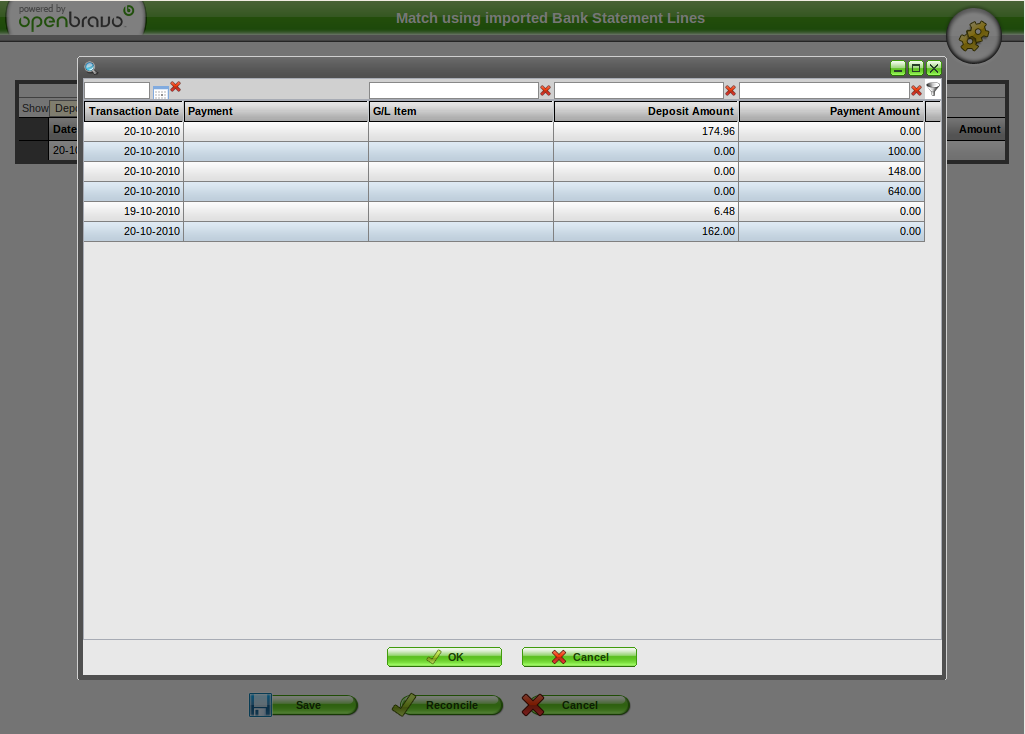 | 2010-10-20 23:59 | rmorley | Summary | "Find" option in "Match using Imported Bank Statement" only shows transaction date and amount => "Find" option in "Match using Imported Bank Statement" is unusable |