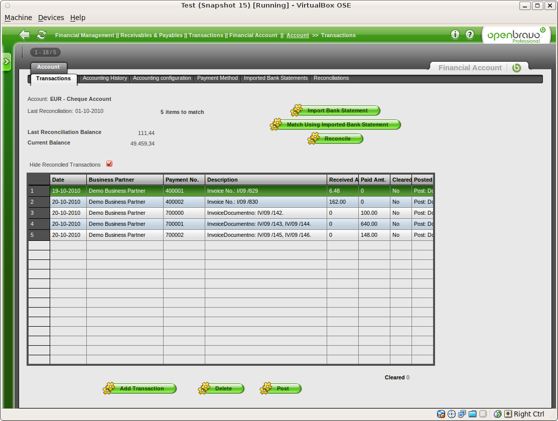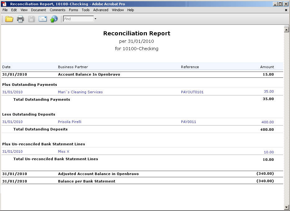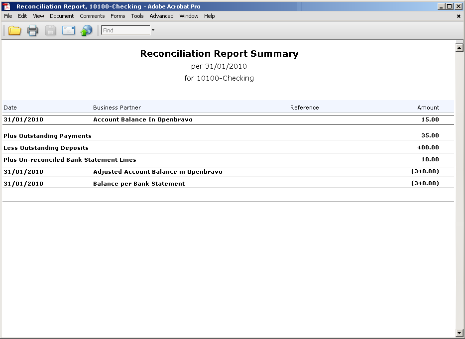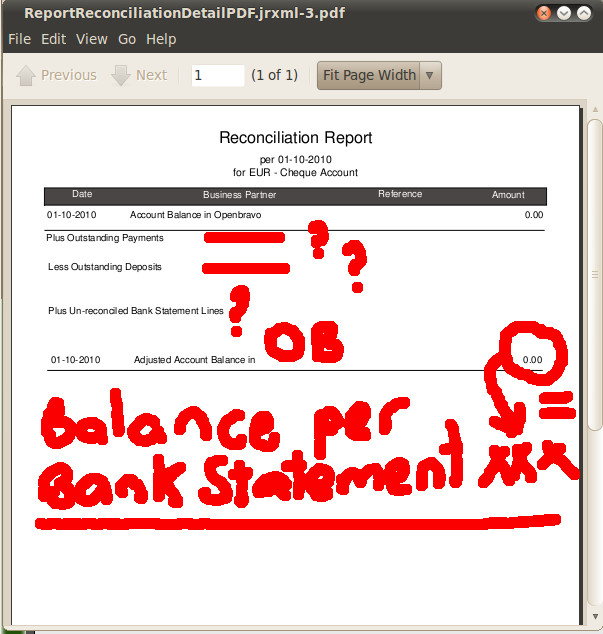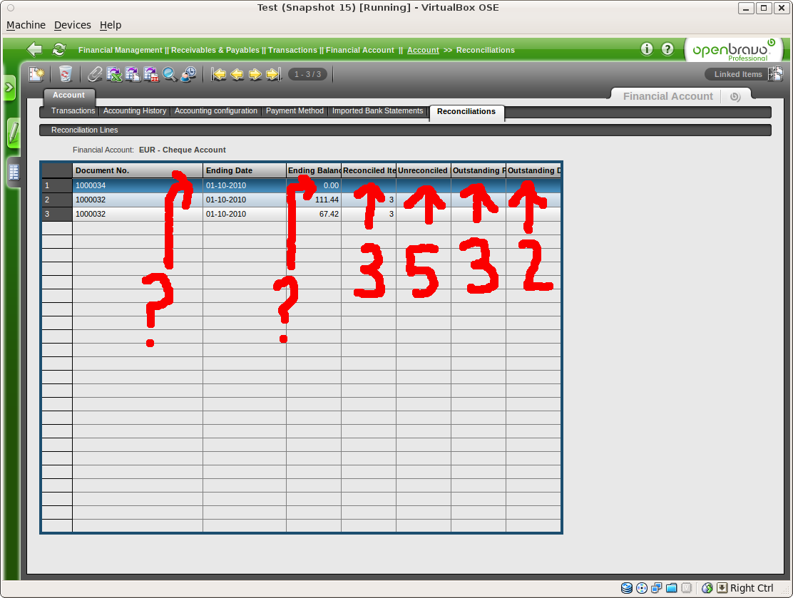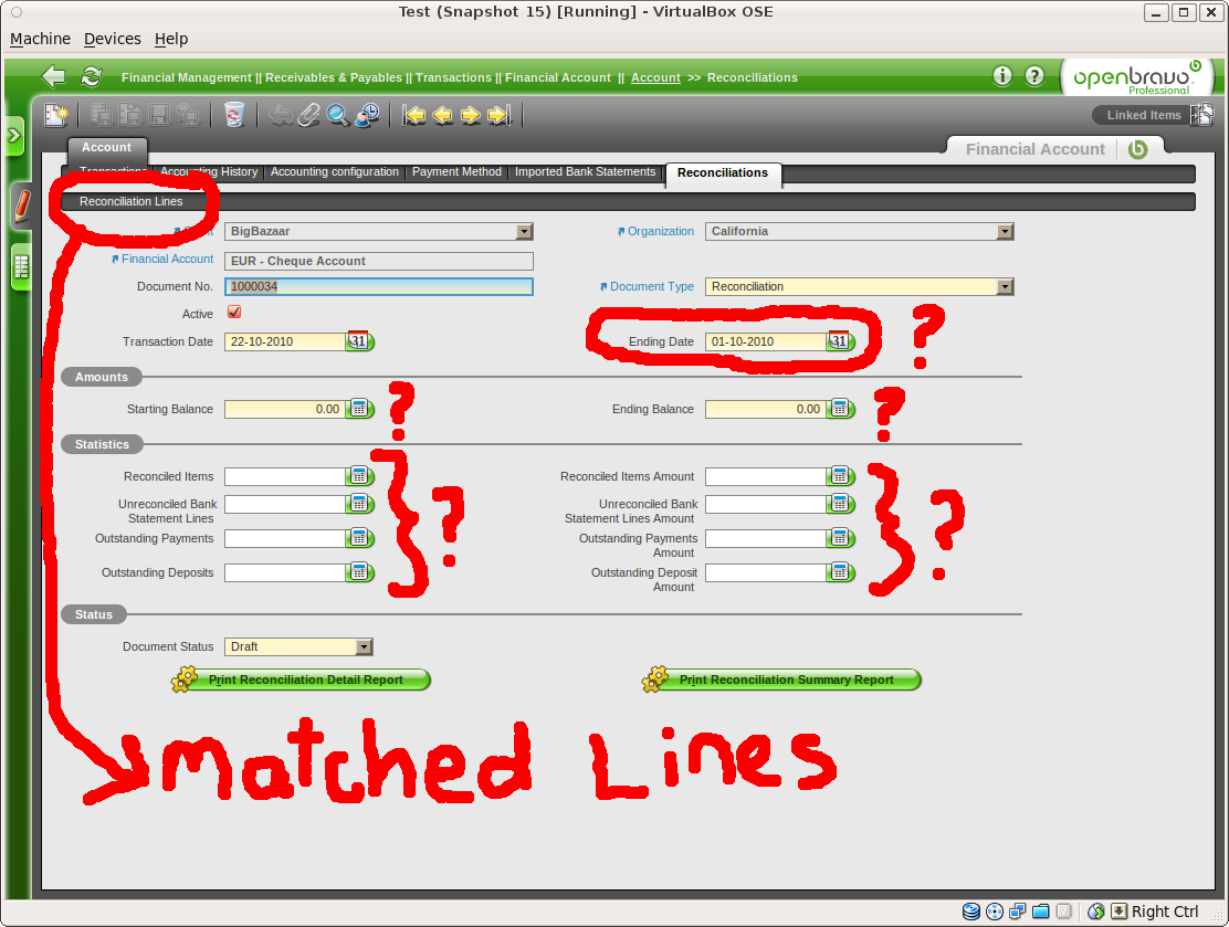| Steps To Reproduce | Import a bank statement and go through the matching process. In my test: - I matched 3 items. - There are 5 unmatched transaction lines in the Financial Account Click on Reconcile in order to process the matched transactions and create a reconciliation statement from the unmatched transactions. Return the transaction screen and check that all 5 remaining transactions are "Cleared" = No. There are 3 outstanding payments and 2 outstanding deposits. See Rec_1.png Click on Reconciliations tab and view Reconciliations in Grid view. See Rec_2.png The data for the reconciliation is not being displayed. View the Reconciliation in Form View. See Rec_3.png It is clear that the reconciliation is not being populated correctly. The sub tab named "Reconciliation Lines" doesn't display reconciliation lines, it shows matched lines. It should be renamed as "Matched Lines". Click on the Detailed Reconciliation Report. It is empty. See Rec_4.png The format is not correct. Same applied to the Summary Report. Please refer to the Reconciliation Report formats in the Functional Specification. | |||||||