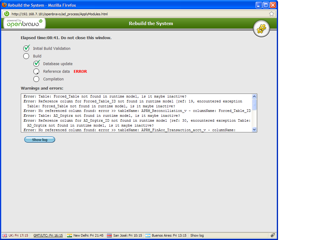 | Steps To Reproduce | 1. Install 3.0RC2 2. Test maturity level for core: test 3. Scan for updates 4. You will find updates for 3.0 and the template 5. Install the updates 6. Rebuild. It is here when it fails See attach Below part of the log: Error: Table: Forced_Table not found in runtime model, is it maybe inactive? Error: Reference column for Forced_Table_ID not found in runtime model [ref: 19, encountered exception Table: Forced_Table not found in runtime model, is it maybe inactive? Error: No referenced column found: error >> tableName: APRM_Reconciliation_v - columnName: Forced_Table_ID Error: Table: AD_Orgtrx not found in runtime model, is it maybe inactive? Error: Reference column for AD_Orgtrx_ID not found in runtime model [ref: 30, encountered exception Table: AD_Orgtrx not found in runtime model, is it maybe inactive? Error: No referenced column found: error >> tableName: APRM_FinAcc_Transaction_acct_v - columnName: AD_Orgtrx_ID Error: Table: C_Locfrom not found in runtime model, is it maybe inactive? Error: Reference column for C_Locfrom_ID not found in runtime model [ref: 30, encountered exception Table: C_Locfrom not found in runtime model, is it maybe inactive? Error: No referenced column found: error >> tableName: APRM_FinAcc_Transaction_acct_v - columnName: C_Locfrom_ID Error: Table: C_Locto not found in runtime model, is it maybe inactive? Error: Reference column for C_Locto_ID not found in runtime model [ref: 30, encountered exception Table: C_Locto not found in runtime model, is it maybe inactive? Error: No referenced column found: error >> tableName: APRM_FinAcc_Transaction_acct_v - columnName: C_Locto_ID and more... | |||||||