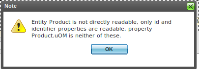 Stacktrace of exception: 186355 [http-8080-3] ERROR org.openbravo.base.exception.OBSecurityException - Entity Product is not directly readable, only id and identifier properties are readable, property Product.uOM is neither of these. org.openbravo.base.exception.OBSecurityException: Entity Product is not directly readable, only id and identifier properties are readable, property Product.uOM is neither of these. at org.openbravo.base.structure.BaseOBObject.checkDerivedReadable(BaseOBObject.java:172) at org.openbravo.base.structure.BaseOBObject.get(BaseOBObject.java:140) at org.openbravo.service.json.DataToJsonConverter.getValueFromPath(DataToJsonConverter.java:197) at org.openbravo.service.json.DataToJsonConverter.toJsonObject(DataToJsonConverter.java:154) at org.openbravo.service.json.DataToJsonConverter.toJsonObjects(DataToJsonConverter.java:101) at org.openbravo.service.json.DefaultJsonDataService.fetch(DefaultJsonDataService.java:125) at org.openbravo.service.datasource.DefaultDataSourceService.fetch(DefaultDataSourceService.java:63) at org.openbravo.service.datasource.DataSourceServlet.doFetch(DataSourceServlet.java:144) at org.openbravo.service.datasource.DataSourceServlet.doPost(DataSourceServlet.java:154) at javax.servlet.http.HttpServlet.service(HttpServlet.java:637) at org.openbravo.base.HttpBaseServlet.serviceInitialized(HttpBaseServlet.java:225) at org.openbravo.base.secureApp.HttpSecureAppServlet.service(HttpSecureAppServlet.java:470) at org.openbravo.client.kernel.BaseKernelServlet.callServiceInSuper(BaseKernelServlet.java:91) at org.openbravo.client.kernel.BaseKernelServlet$1.process(BaseKernelServlet.java:65) at org.jboss.seam.servlet.ContextualHttpServletRequest.run(ContextualHttpServletRequest.java:53) at org.openbravo.client.kernel.BaseKernelServlet.service(BaseKernelServlet.java:62) at org.openbravo.service.datasource.DataSourceServlet.service(DataSourceServlet.java:75) at javax.servlet.http.HttpServlet.service(HttpServlet.java:717) |