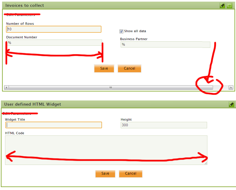 | Description | The edit parameters widget view can be improved: Label "Edit Parameters" can be removed (as it is very obvious) Field length can be doubled Query widgets show a horizontal sliderbar, for no reason! HTML widget has a very small html field. This is inconvenient for pasting large html snippets. Must be enlarged. | |||||||
