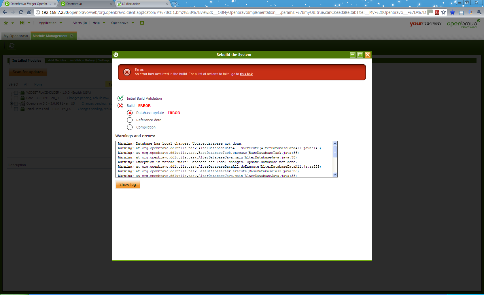 - Rebuild happened fine, with one warning (link to more detail took me to the generic http://wiki.openbravo.com/wiki/ERP/2.50/Update_Tips [^] page)
