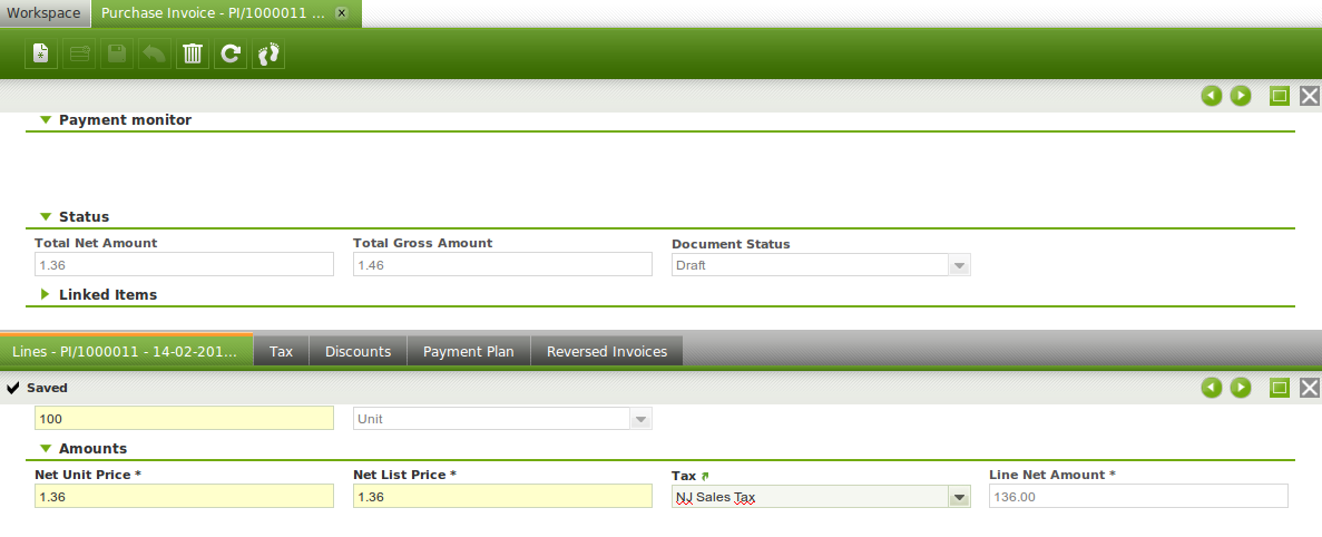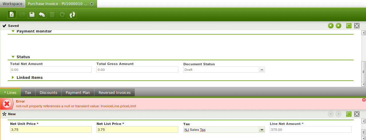 I'm entering a purchase invoice for the below: [Header] organization : F&B US Inc Transaction Dcoument: US AP Invoice Business Partner : Happy Drink Inc Payment Method : Wire Transfer Payment terms : 30 days [Lines] Product : Rosé Wine Invoiced Quantity : 100 The error appears when I save the line. |
