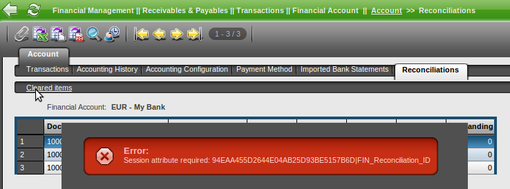 | Steps To Reproduce | 1. Create Financial Account, without specify "Matching algorithm" 2. Go to Transactions tab and click on Add Transaction button 2.1. Select Transactions Type 'Fee' 2.2. Enter 50€ Paid Out 2.3. Click OK button 3. Click on "Reconcile" button in Transactions tab. Select previosuly inserted transaction and press Save button. 4. Go to Reconciliations tab in GRID VIEW. Try to access to Cleared Items tab You will obtain error Error: Session attribute required: 94EAA455D2644E04AB25D93BE5157B6D|FIN_Reconciliation_ID | |||||||
