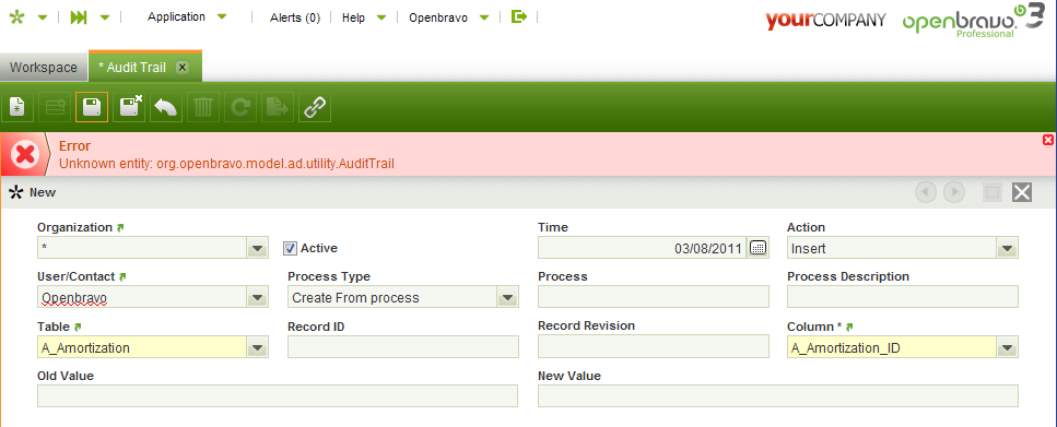 DescriptionAudit Trial window should be a read only window. However, I can go there and click New. It lets me to fill the form as if it were fully functional. When I click Save it shows me an error.