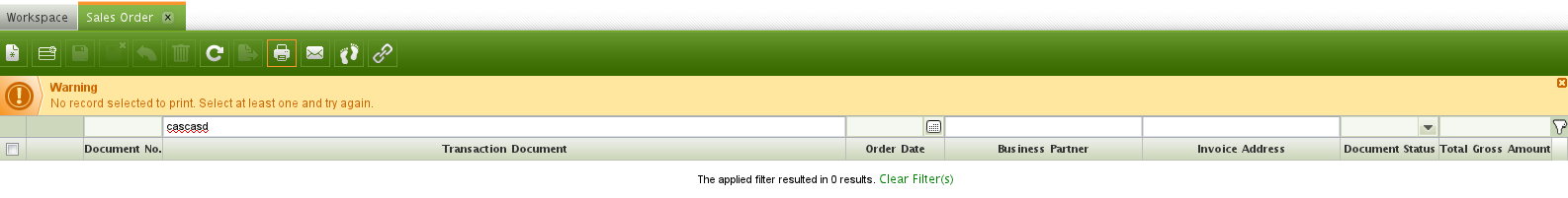 | Steps To Reproduce | open sales order grid use any filter to get no rows shown see that the print (and also email) buttons are active and show an error message if used. | |||||||