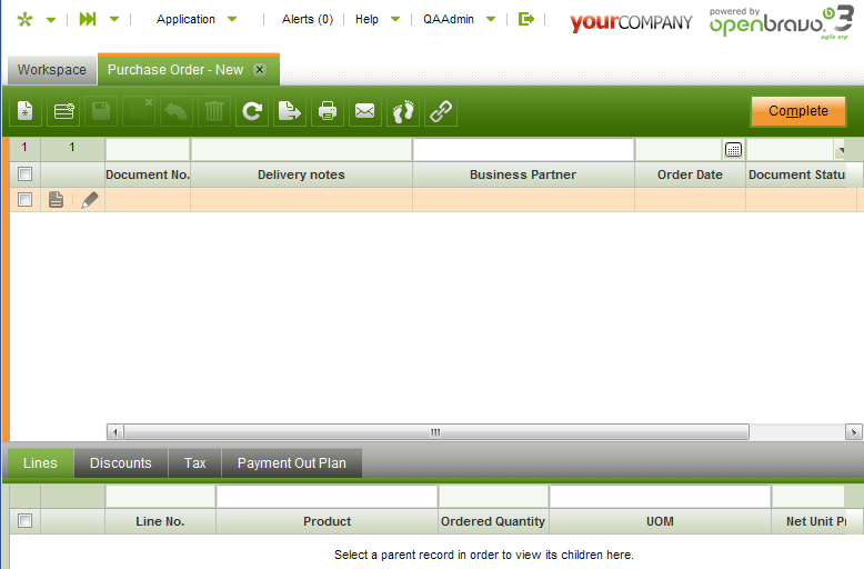 | Steps To Reproduce | 1. Enter as QAAdmin 2. Go to Purchase Order 3. Click "New in Grid". A record appears in the grid with the fields in edition mode. 4. Hit the Tab key to move from "Document No" (first focused field) to next field. The edition mode is gone. However, the record was not actually saved. See screenshot. Tested in Firefox 4 and Chrome 10. | |||||||
