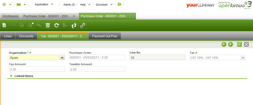 | Steps To Reproduce | 1. Log in as QAAdmin 2. Go to Purchase Order 3. Create a new header, filling it with valid data and save. 4. Create a line for Raw Material A. Save. 5. Complete the Order. 6. In the header, open the Linked Items section 7. Seek for the Tax item and navigate to it. The item is opened in a new tab. See screenshot. | |||||||