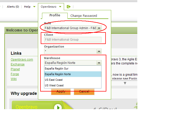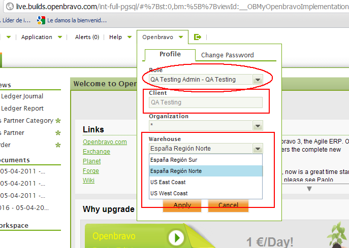 | Description | The problem is even worse. Openbravo user has access to two different clients: 1. F&B 2. QA Testing When you change from a role that belongs to F%B to QA Testing all the combo boxes are properly recalculated except the Warehouse combo where nothing changes and you still have the values that belong to F&B. So this has several side effects that breaks the ERP. For example you cannot select products in transactional windows because it filters the warehouse by one that belongs to the other client See attach: error.png error1.png error2.ong | |||||||