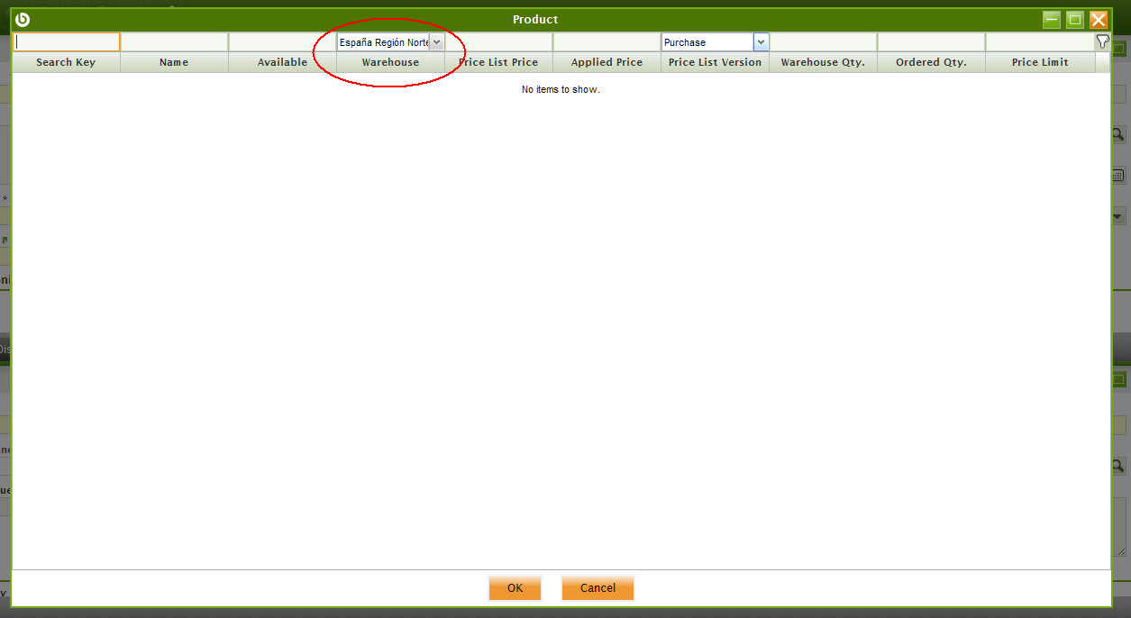 | Steps To Reproduce | 1. Login as Openbravo/openbravo 2. Display the warehouse combo. See error.png 3. Change the defaulted role to QA Testing Admin 4. Display the warehouse combo. See error1.png. Notice that the values are the same. This is wrong Side effect. 1. Go to purchase invoice. Create one header selecting Vendor A. Save 2. Move to lines and click the product selector to open it. See error2.png No products are shown because it is filtering by a warehouse that not exists in that client | |||||||