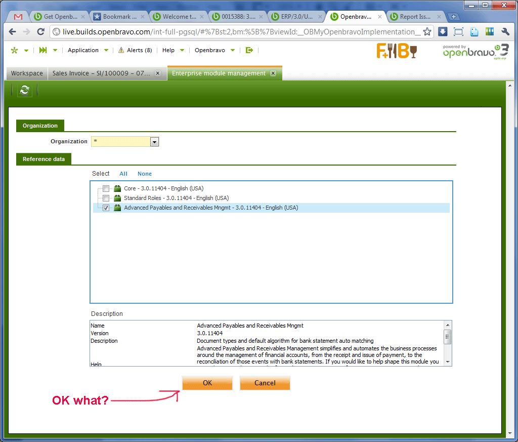 | Description | This window is to apply reference data to an organization you choose. In fact, this window is, apart from Renate´s issue (15388), not clear at all. The OK button does not convey what the action is. On top of that, users who do not know they have to apply the ref.data to an organization before a newly installed module appears, will never figure this out without a manual. I suggest to also add a link/hint in the Module Management window to "apply reference data" when needed. A redesign is needed. | |||||||||||